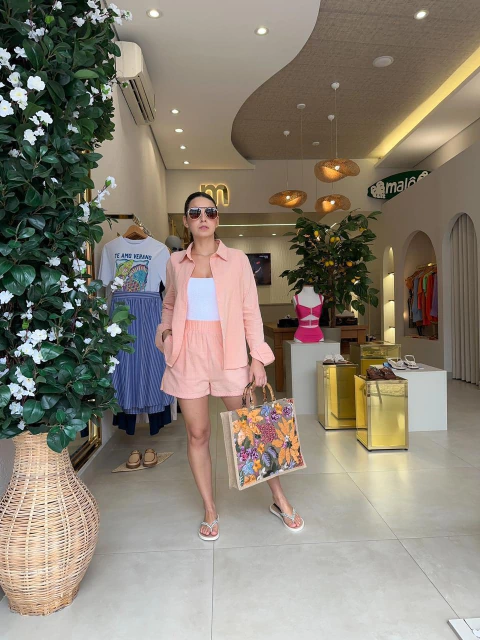 Conjunto Chloe é composto por camisa e short confeccionados em tecido leve com toque de linho, perfeito para um visual fresco e elegante. A camisa possui modelagem soltinha, gola clássica e fechamento por botões frontais, podendo ser usada aberta ou fechada. O short tem cós elástico, bolsos laterais funcionais e comprimento curto, oferecendo conforto e praticidade.